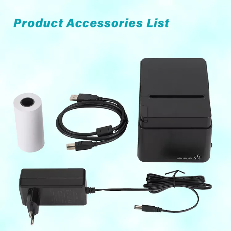 1.Pacáiste san áireamh: printéir admháil 80mm, rolla páipéir, cábla usb, lámhleabhair, adapter.